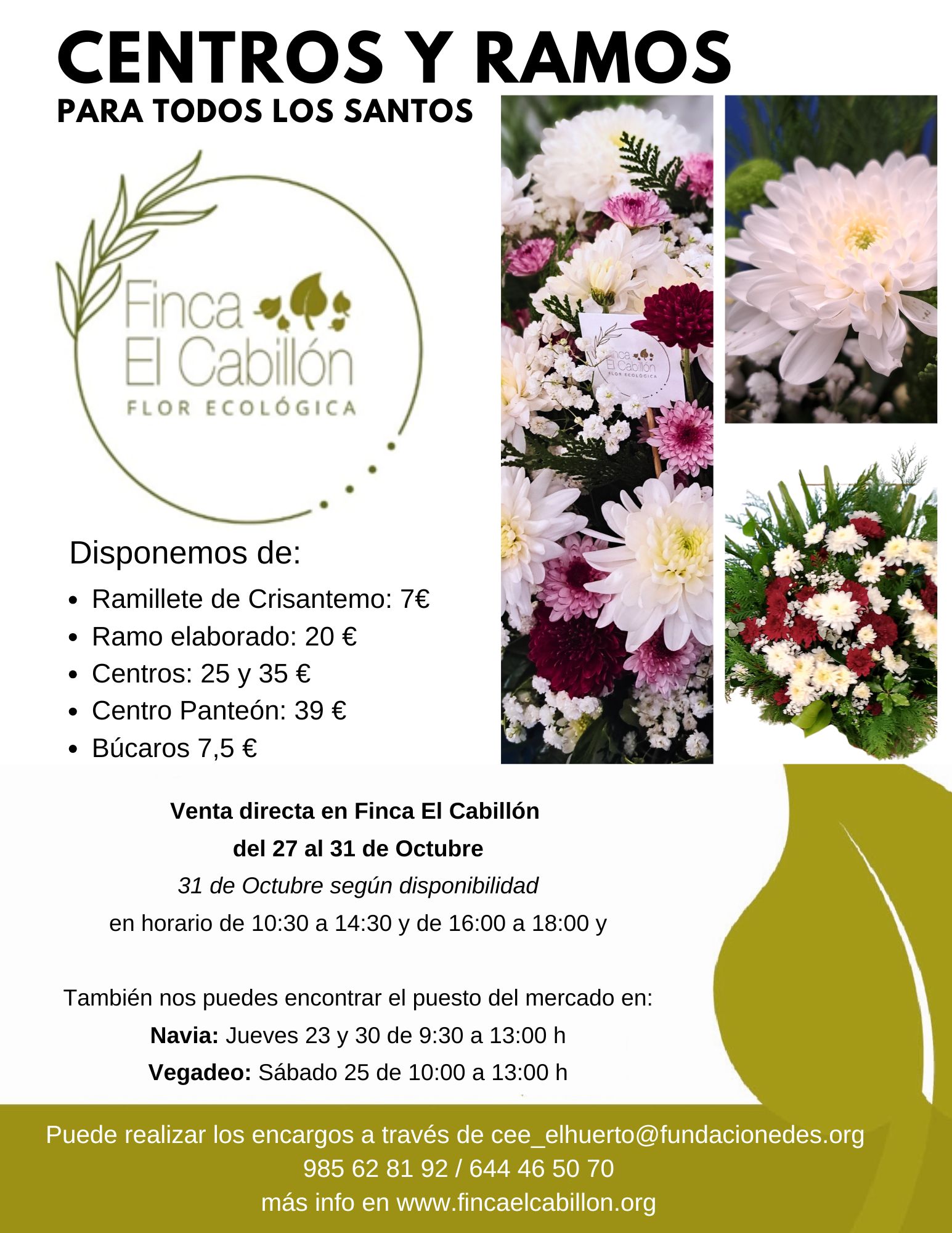 La compra directa y/o recogida de encargos se podrá realizar, en horario de10:00-13:00 h, el sábado día 25 en el mercado de Vegadeo, el martes 28 en La Caridad, el jueves 30 en el mercado de Navia. Y en la propia Finca El Cabillón los días 27, 28, 29, 30 y 31, en horario de 10:30 a 14:30 y de 16:00 a 18:00 h.